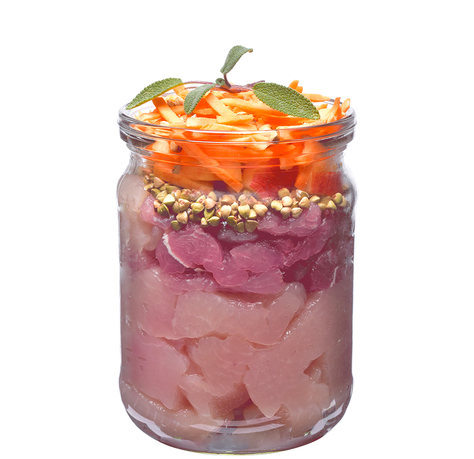 48% chicken, 28% turkey, 11% broth, 4.5% sweet potatoes, 2% apples, 2% minerals, 1.3% buckwheat, 1% blend of herbs (rosemary, thyme, marigold, dandelion), 1% salmon oil, 0.5% parsley, 0.5% linseed, 0.2% algae and black currant