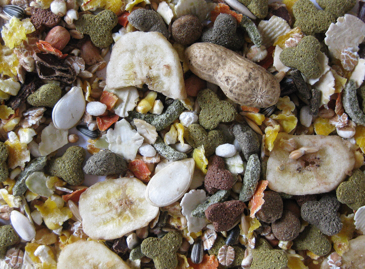 Cereals, vegetables (min. 12% of which 60% pea flakes, 20% green beans, 13% carrot pieces), derivatives of vegetable origin, vegetable protein extracts, fruit (min. 5% of which 50% carob, 40% banana), meat and animal derivatives, seeds, nuts (min. 3% peanuts), minerals, various sugars, oils and fats, yeasts