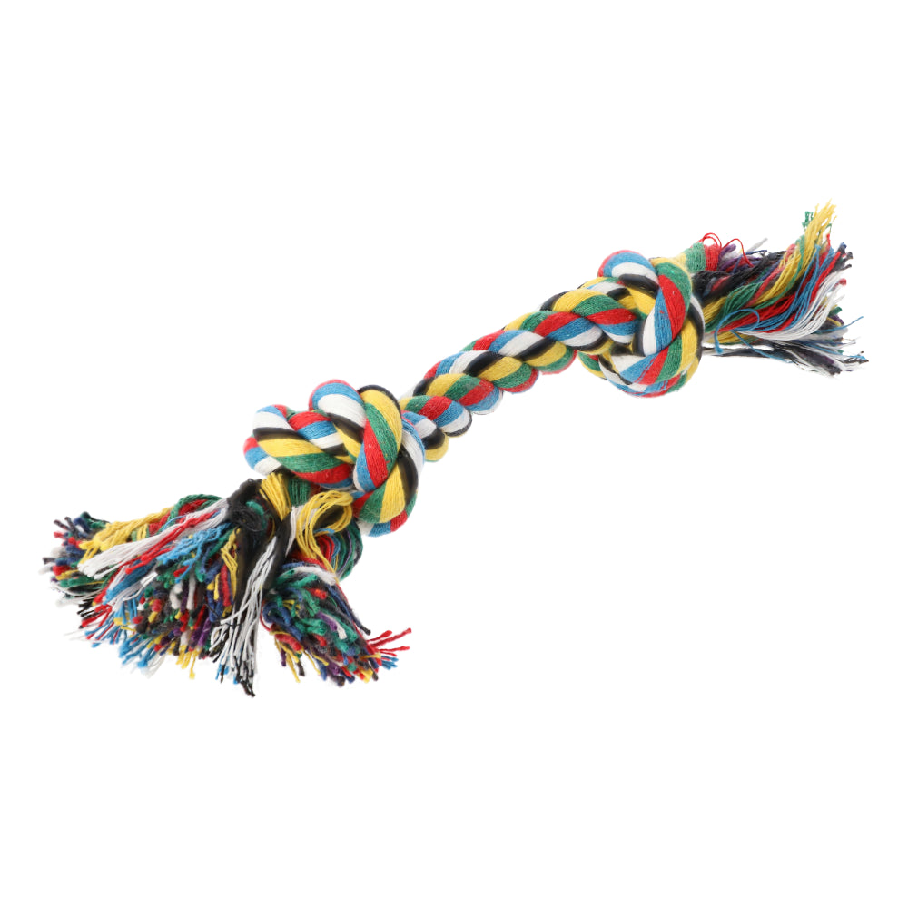 The 2-knot rope toy is made of a high-quality, colorful and braided rope that massages the gums and cleans the teeth when biting.
