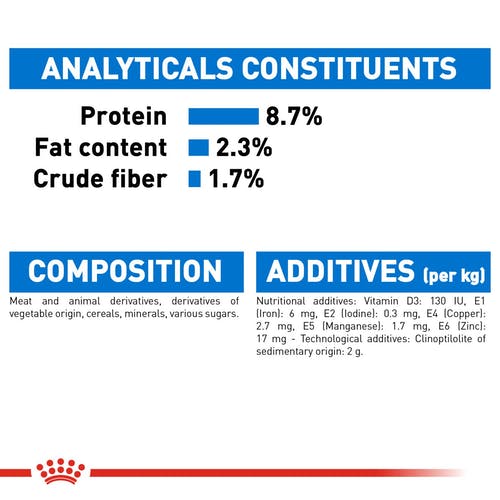 Analytical constituants: Protein: 8.7% - Fat content: 2.3% - Crude ash: 1.7% - Crude fibres: 1.7% - Moisture: 81.0%.