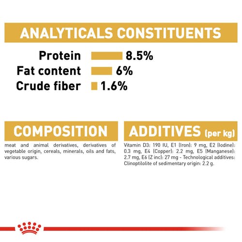 Analytical constituents: Protein: 8.5% - Fat content: 6.0% - Crude ash: 2.2% - Crude fibres: 1.6% - Moisture: 78.0%.