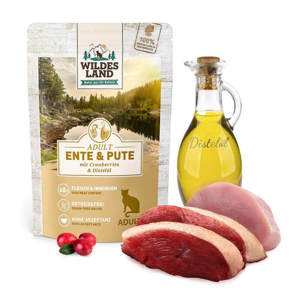 Cats need a balanced diet for optimal well-being. The selection of the right cat food should be based on the natural dietary needs of the cat. Wildes Land Duck and turkey with cranberries and fine cranberries is a food for adult cats and supports the optimal nutrition of your pet.